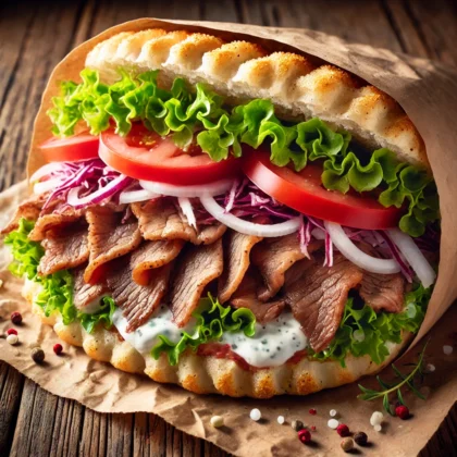 gerollter Teig mit Falafel, Salat und Sauce